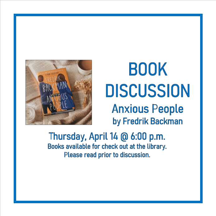 Join us at the St. Marys Community Public Library in a discussion of Anxious People by Fredrik Backman on Thursday, April 14, 2022. We will meet from 6:00 to 7:00 p.m. in the library meeting room. Books are available at the library to check out and read prior to our discussion.