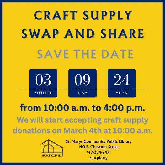 In preparation for this event, items can be dropped off at the library between on Monday, March 4th and Friday, March 8th. Some of the items donated in the past are decorative items, crafting tools, and crafting supplies.